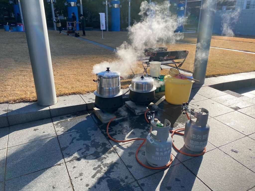 会場にはガス釜と大きなセイロを設置し、もち米をふっくら蒸し上げます。