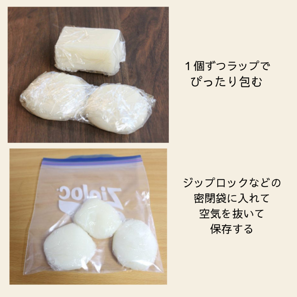 👉 ポイントは「つきたての柔らかい状態」で冷凍すること! 乾いてから包むと風味が落ちてしまいますので注意⚠️