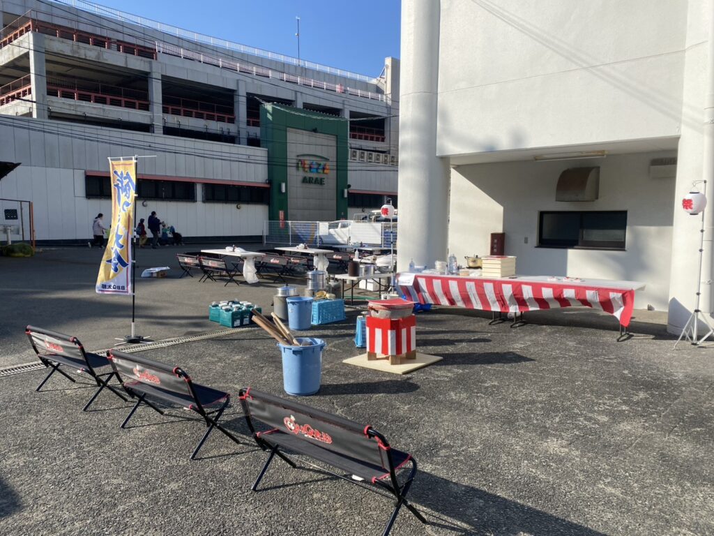 スタッフが到着後、会場に機材を設置。ガスを点火し、せいろで餅米を蒸し始めます🔥